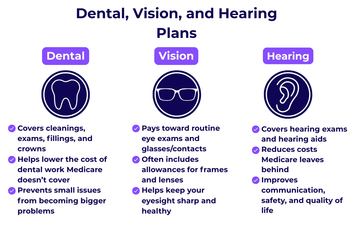 Extra Benefits such as dental, vision, hearing, wellness programs, and sometimes transportation or over-the-counter allowances.